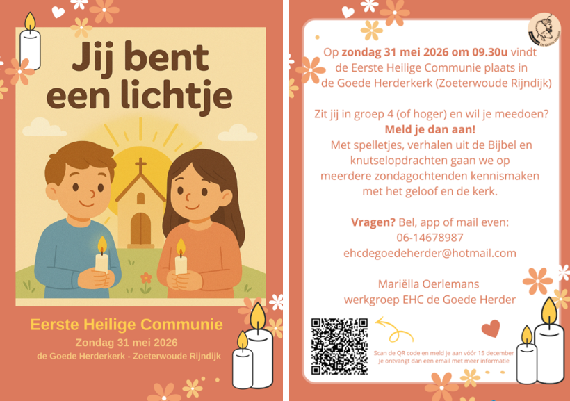 Parochiekern De Goede Herder — Donderdag 11 december: ‘Gezegend het licht’: Oecumenische Adventsvespers (3/4), Goede-Herderkerk (Zoeterwoude-Rijndijk). Aanvang: 19:15-19:45 uur. — Woensdag 17 december: viering in de Mariakapel; aanvang: 10:00 uur. Aansluitend koffiedrinken in de Herdershof. — Het secretariaat is geopend op maandag- en woensdag en vrijdagochtend van 9:00-12:00 uur. Tijdens deze dagdelen kunt u bij het Maria-altaar in de kerk ook een kaarsje opsteken. — Voor meer informatie: raadpleeg de meest recente nieuwsbrief d.d. 14 december 2025 (pdf) en de parochiekernpagina op de website.